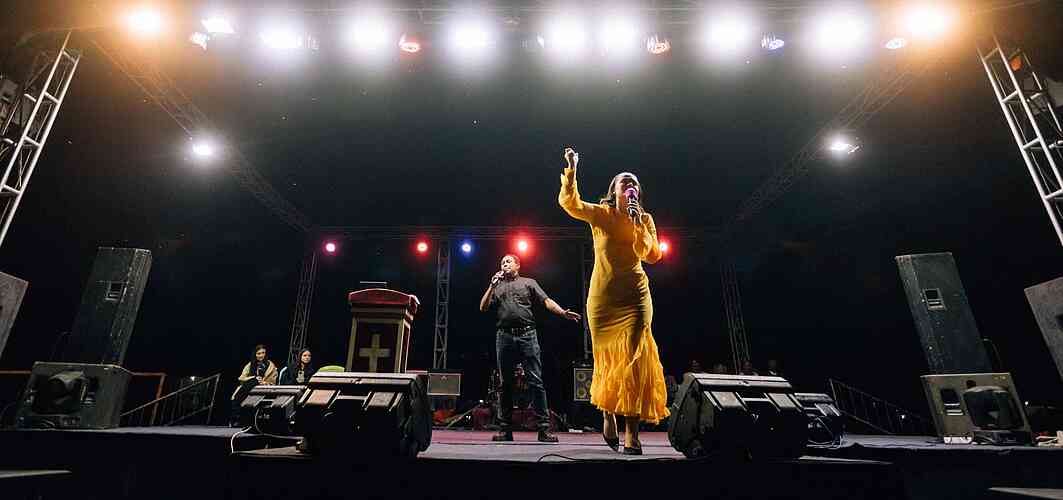 As soon as Evangelist Aleks said, “Come Holy Spirit”, the speakers started sparking with fire and burning up, and the lights turned off. The crowd of 45,000 people let out a big roar.