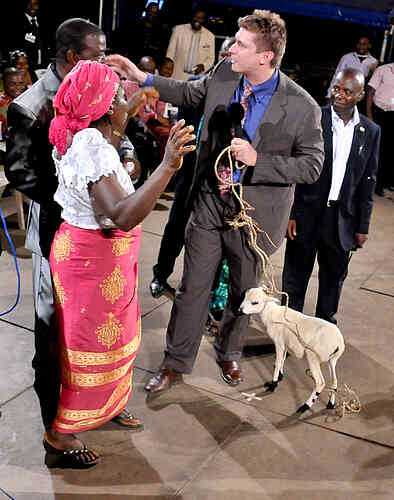 Právě skončil další úžasný týden evangelizace v moci Ducha Svatého zde v Agbani v Nigérii. Shromáždění navštívilo půl miliónu lidí a mnozí z nich přijali Ježíše Krista za svého Spasitele a Pána. Lidé byli naplněni radostí a vděčností. Jedna vzácná žena mi přinesla dárek a na pódiu mi ho dnes předala - malou ovečku! Teď musím vymyslet, jak jí dostanu do kufru.