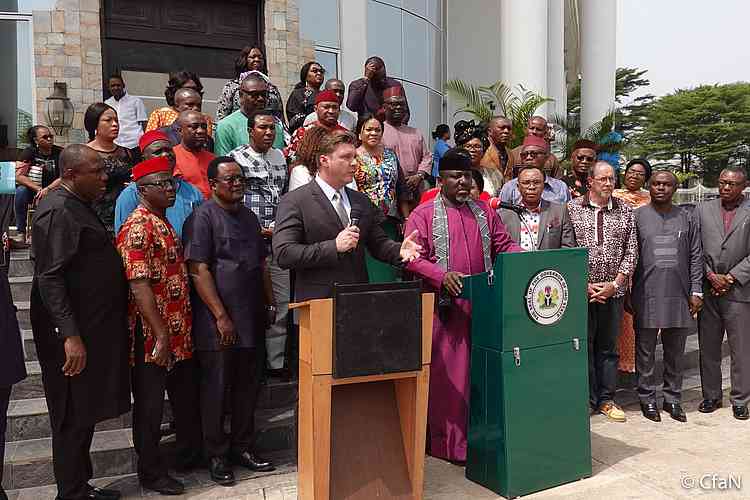 Dnes pro vám máme několik velice zajímavých fotografií z našich dobrodružství. Vše začalo návštěvou guvernéra státu Imo zde v Owerri, Nigérii. Byl jsem pozván do guvernérova sídla, abych promluvil ke guvernérovi, první dámě, zástupci guvernéra a všem vrcholným členům vládního kabinetu. Byla to vzácná příležitost prezentovat tak vysoce postaveným lidem Ježíše. Po návštěvě proběhla s guvernérem a se mnou tisková konference, které se zúčastnila všechna regionální média a na které jsem dostal příležitost pozvat veřejnost na naši kampaň. (DK)