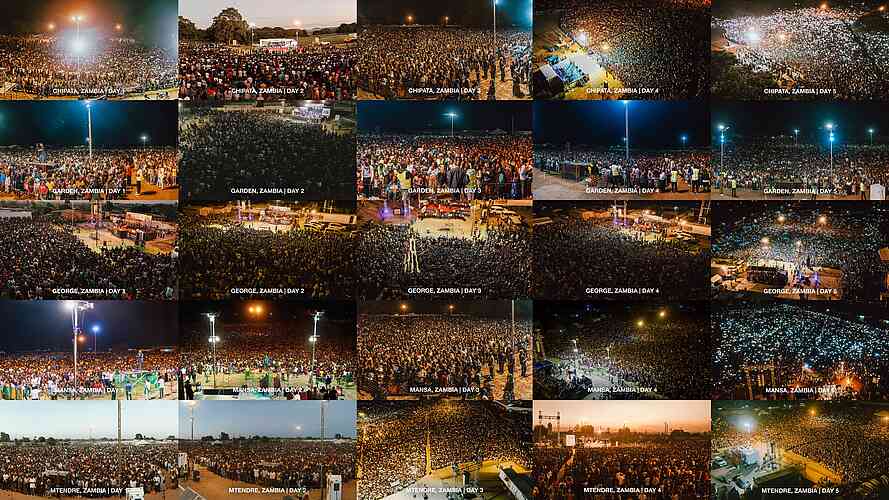Dnešní den je dalším významným milníkem pro Krista pro všechny národy, možná i pro celé dějiny misionářské evangelizace. Dnes večer odstartovalo 11 kampaní v 11 různých městech/čtvrtích Zambie, které proběhnou naráz ve dvou týdnech po sobě! Naši první kampaň jsme v Zambii uspořádali již v roce 1981 a od té doby zde proběhlo celkem 12 kampaní. Během příštích dvou týdnů počet kampaní tedy téměř zdvojnásobíme! Tento týden také docílíme 38 kampaní za posledních 38 měsíců a očekáváme, že počet zdokumentovaných rozhodnutí se přiblíží hranici 90 miliónů! Je skvělé být naživu v tak úžasné době.