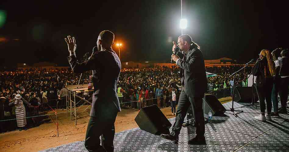 Am ersten Abend bekamen sie Besuch von Evangelist Daniel Kolenda, der über Glauben lehrte und für die Kranken betete. Überall in der Menge passierten Wunder, auch eine Großmutter wurde geheilt, die schon so lange blind war, dass sie sich nicht mehr an die Anzahl der Jahre erinnern konnte! Doch das war erst der Anfang dessen, was der Herr während der fünftägigen Evangelisation in Ngombe tun sollte.