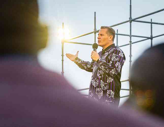Lorsque nous sommes arrivés sur le terrain ce soir, Peter Vandenberg et moi-même étions tous deux enthousiastes. Nous avons pu constater que la foule était assez nombreuse pour une première soirée et qu’elle semblait animée. Après être sortis de la voiture dans laquelle nous étions arrivés, je me suis faufilé sur le côté de la scène pour voir les milliers de personnes qui dansaient et souriaient. En les regardant, j’ai commencé à rire du fait que j’étais sur le point de leur prêcher. « Dieu a certainement le sens de l’humour », me suis-je dit.