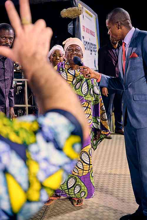 De loin, on pouvait voir que quelque chose s’était passé et qu’elle venait probablement de recevoir un miracle puissant. Elle est ensuite venue sur le côté de la scène pour témoigner. Madame Africa souffrait de violentes douleurs à l’estomac qui l’empêchaient de marcher droit. Pendant la prière, elle a été complètement guérie. Sur scène, elle a pu se pencher, marcher droit et même danser, démontrant ainsi qu’elle ne souffrait plus du tout ».