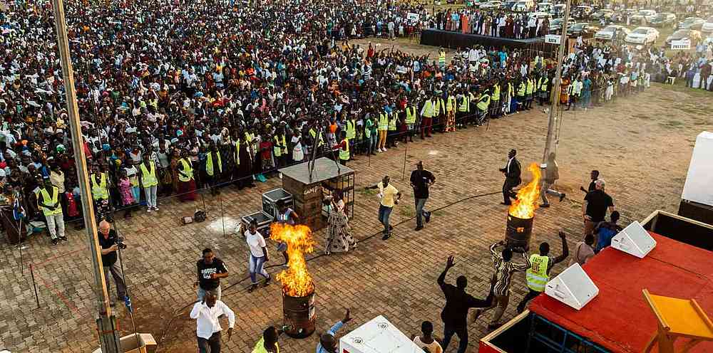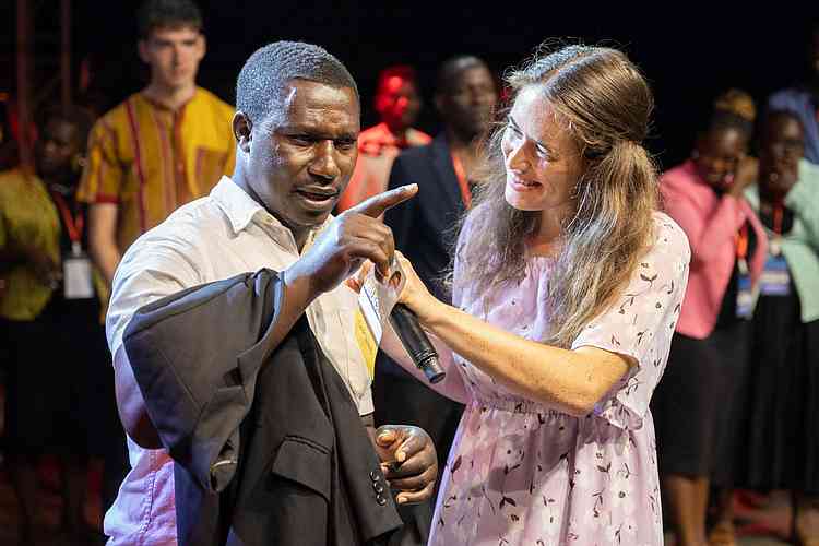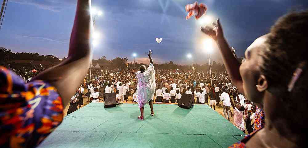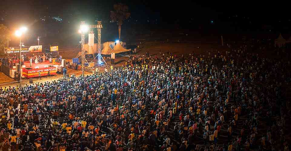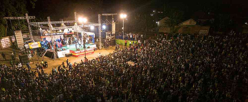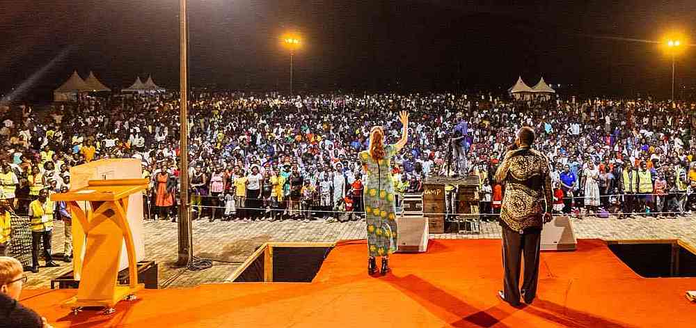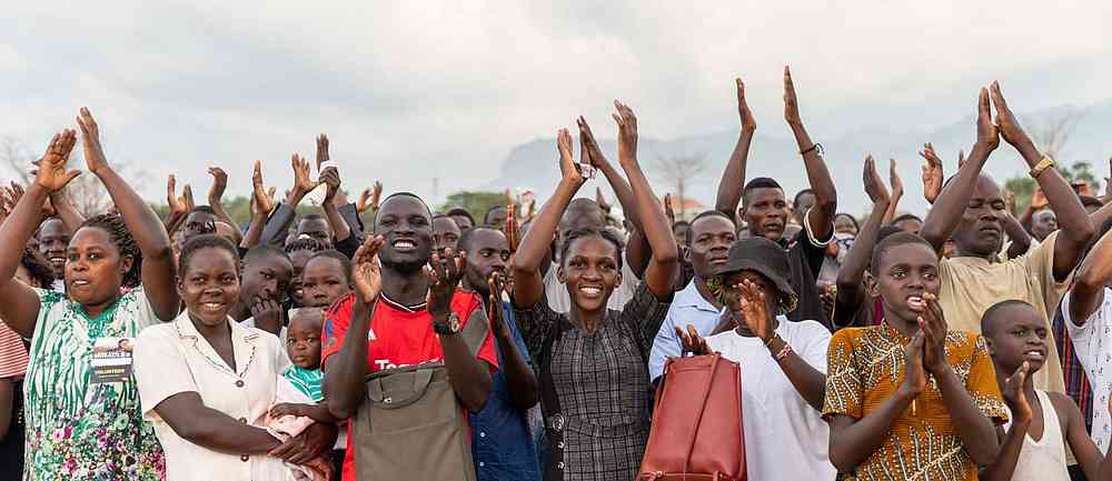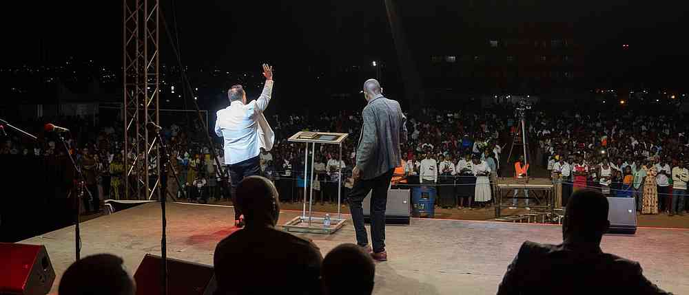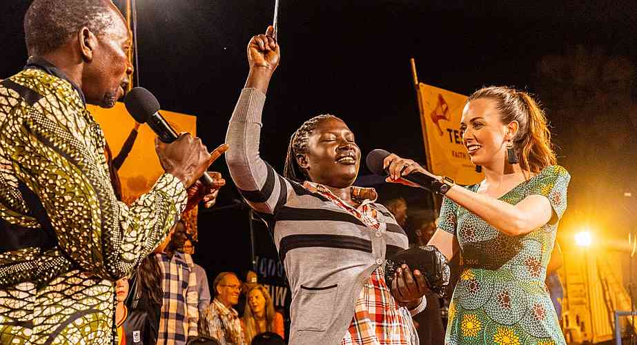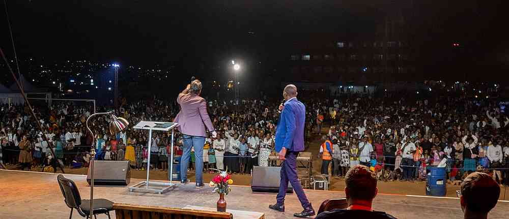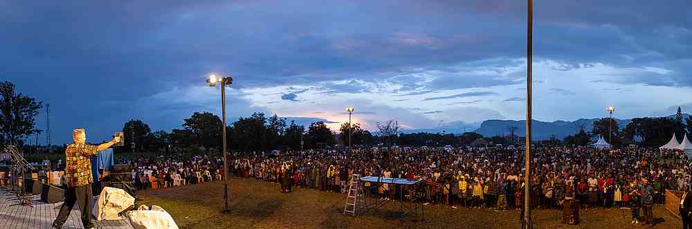 « Alors que nous arrivions sur le terrain, l’atmosphère était bien lourde ! Certains habitants d’Iganga ont marché plus de 6 km jusqu’au terrain d’évangélisation. Alors que le soleil se couchait, un vent s’est soudain levé, apportant de l’air beaucoup plus frais et même des éclairs au loin. Malgré le changement soudain de temps, il y a eu un changement soudain dans la vie des gens lorsque l’évangéliste Daniel Kolenda a commencé à prier pour le salut ! Des milliers de personnes ont élevé leur voix à l’unisson, se repentant et demandant à Jésus d’être le Seigneur de leur vie. Ce son indescriptible de personnes criant vers le Seigneur ne vieillit jamais. En fait, il vous frappe au cœur, plein de compassion, d’amour et d’admiration pour la bonté et la miséricorde de Dieu. Pendant que les gens criaient au Seigneur, il s’est mis à pleuvoir, mais personne n’est parti. C’était un beau symbole de la nouvelle naissance dans l’Esprit ».