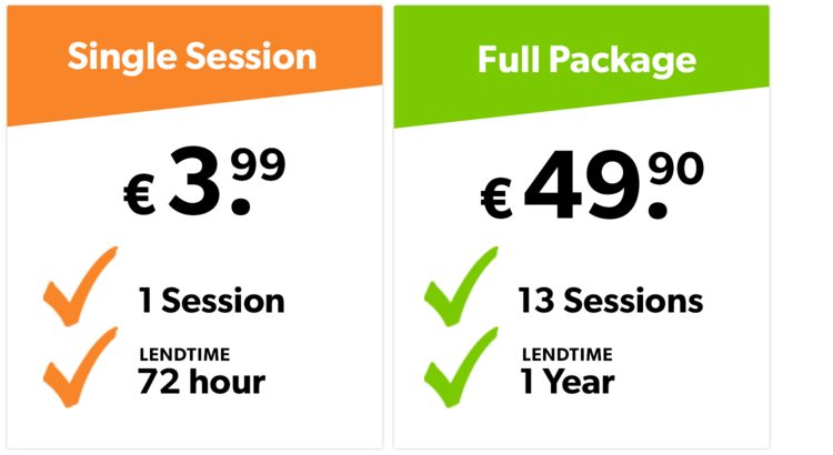 For € 3.99 per single Session, you can watch a video in the online lending library as many times as you like over a 72-hour period.