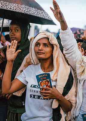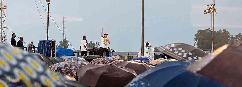 I grabbed a raincoat and climbed onto the platform. Mic in hand, I looked over the drenched crowd and commended their faith.